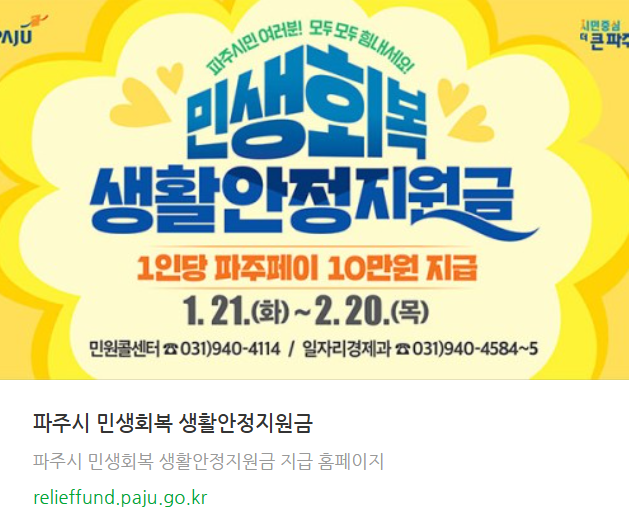-지급방법 : 지원금을 신청하면 다음 달 오후부터 개인당 10만 원을 지역화폐인 파주페이로 받을수있고, 즉시 사용할 수 있습니다.